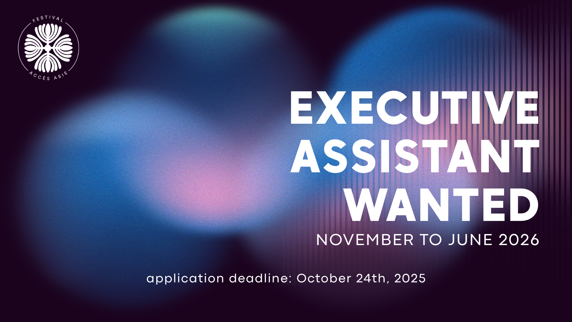 Festival Accès Asie is seeking a motivated and dynamic individual for the position of Executive Assistant. This is a temporary full-time position under the Emploi Québec wage subsidy (work experience component) from November 17th to June 12th, 2025.